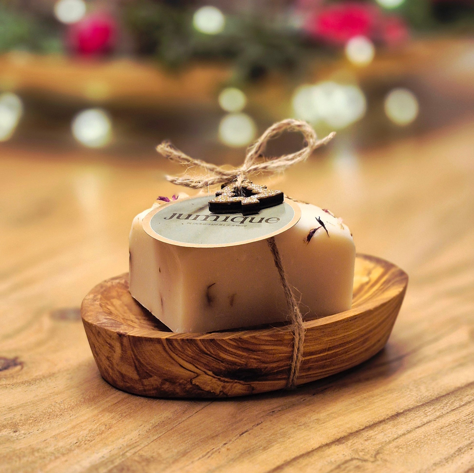 Die Seife ruht auf einer handgefertigten Seifenschale aus Olivenholz, die nicht nur praktisch ist, sondern durch ihre natürliche Maserung jedes Set zu einem Unikat macht. Abgerundet wird das Geschenkset durch eine Juteschleife sowie eine liebevolle, jahreszeitliche Dekoration, die dem Ganzen einen natürlichen und hochwertigen Look verleiht.